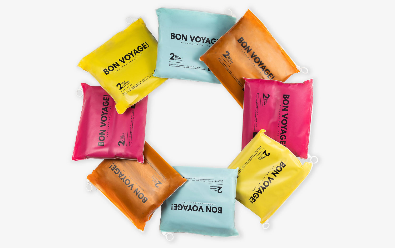 Every colourful Bon Voyage! pouch contains two single-use, biodegradable, individually wrapped seat covers that fit perfectly over chairs on airplanes, trains, buses and movie theatres. Our seat covers are designed to create a barrier between you and your germ-invested seat. So say goodbye to trying to sanitize your seat and say hello the cleanest way to travel. Finally, you can sit back, relax and enjoy a Bon Voyage!